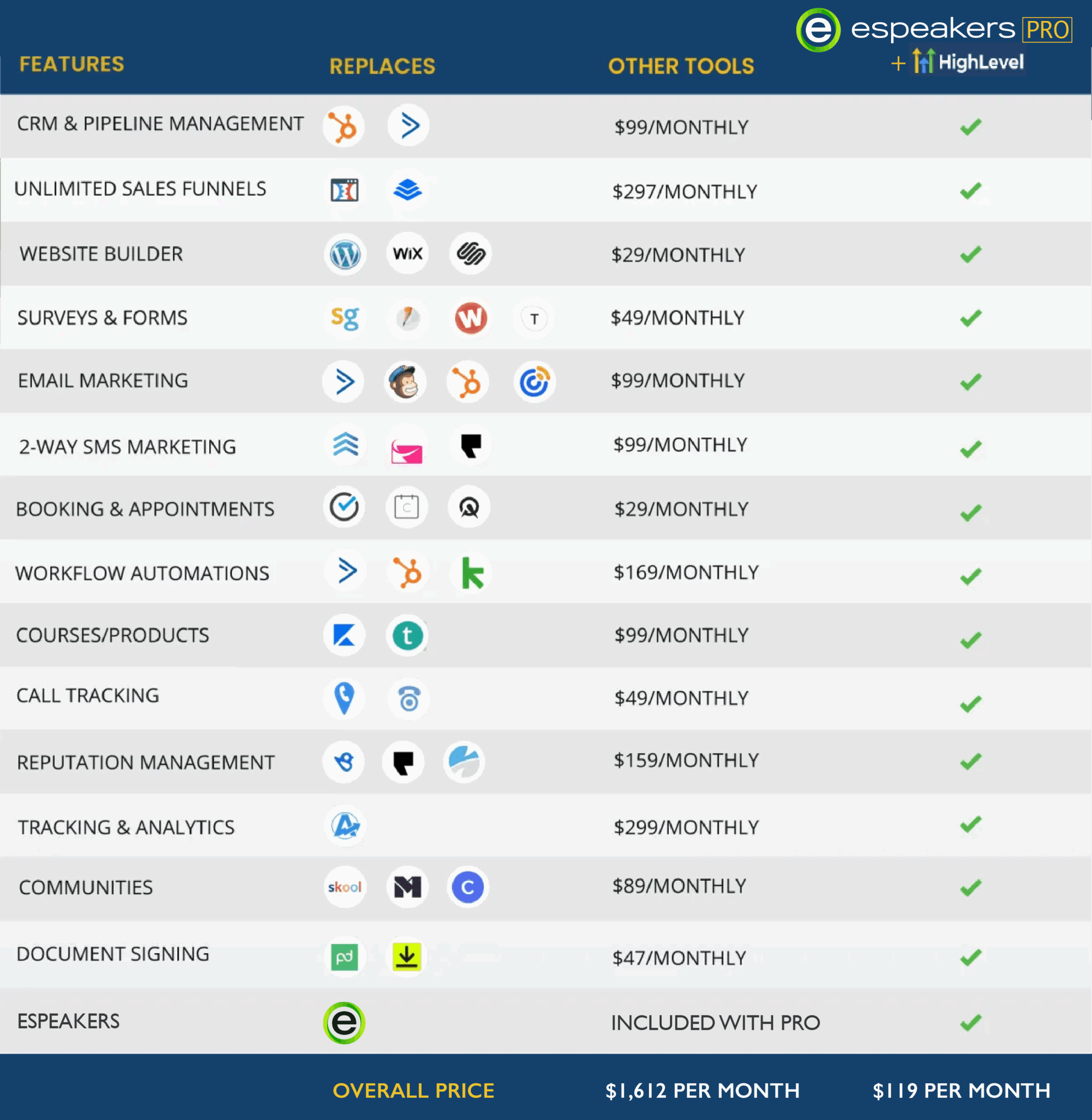 All Pro Members will have full access to our (NEW) HighLevel CRM + Marketing Suite —at no extra cost! This new suite of tools acts as an extension to our signature eSpeakers features, enabling you to create powerful marketing automations, templates, funnels, courses, programs, and more.